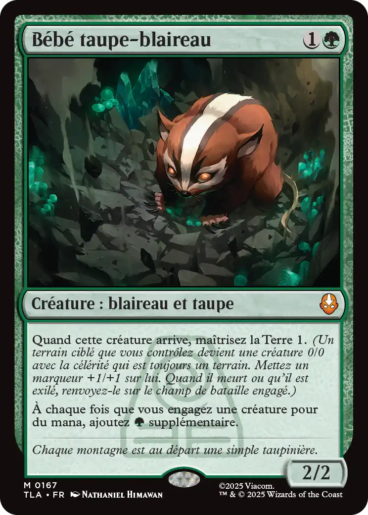 Bébé taupe-blaireau est une 2/2 pour 2 manas qui transforme l'un de vos terrains en créature 0/0 avec un marqueur +1/+1 grâce à la mécanique "Maîtrisez la Terre".