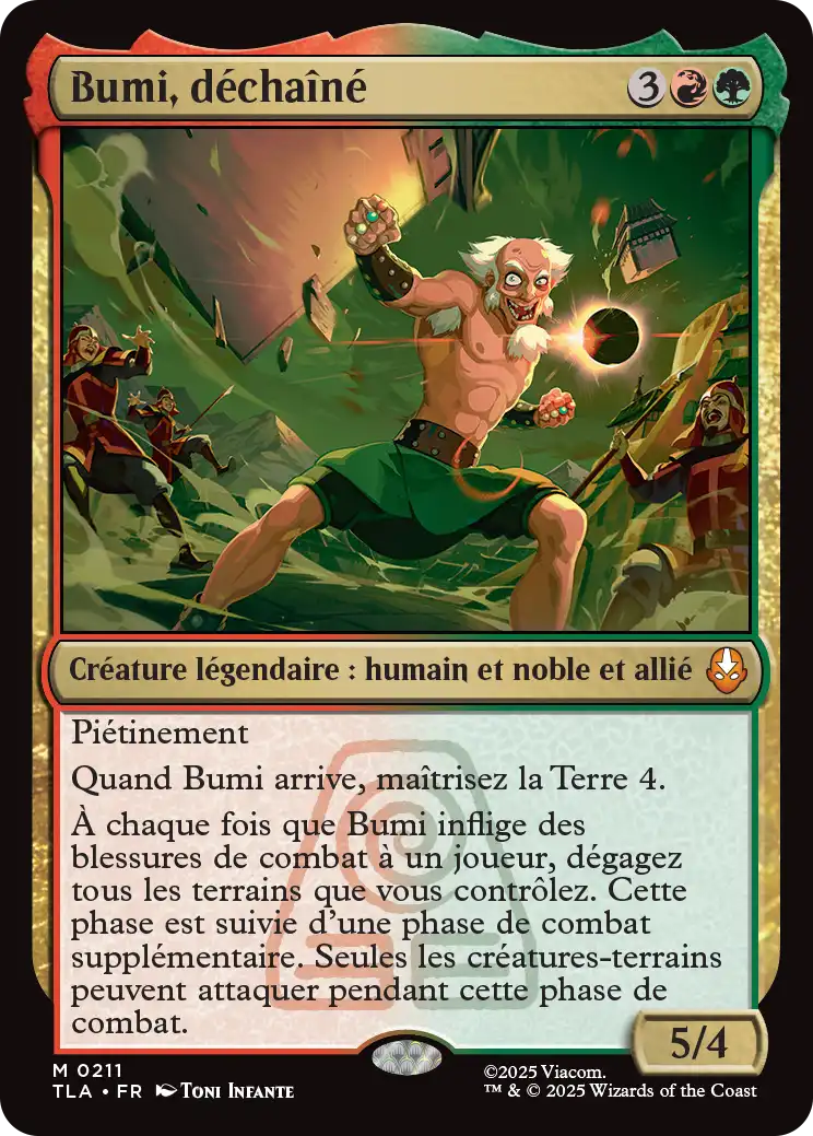 Bumi, déchaîné est une 5/4 avec le piétinement et "maîtrisez la Terre 4" lors de son arrivée en jeu. Vous transformez l'un de vos terrains en créature 0/0 avec 4 marqueurs +1/+1 et la célérité.