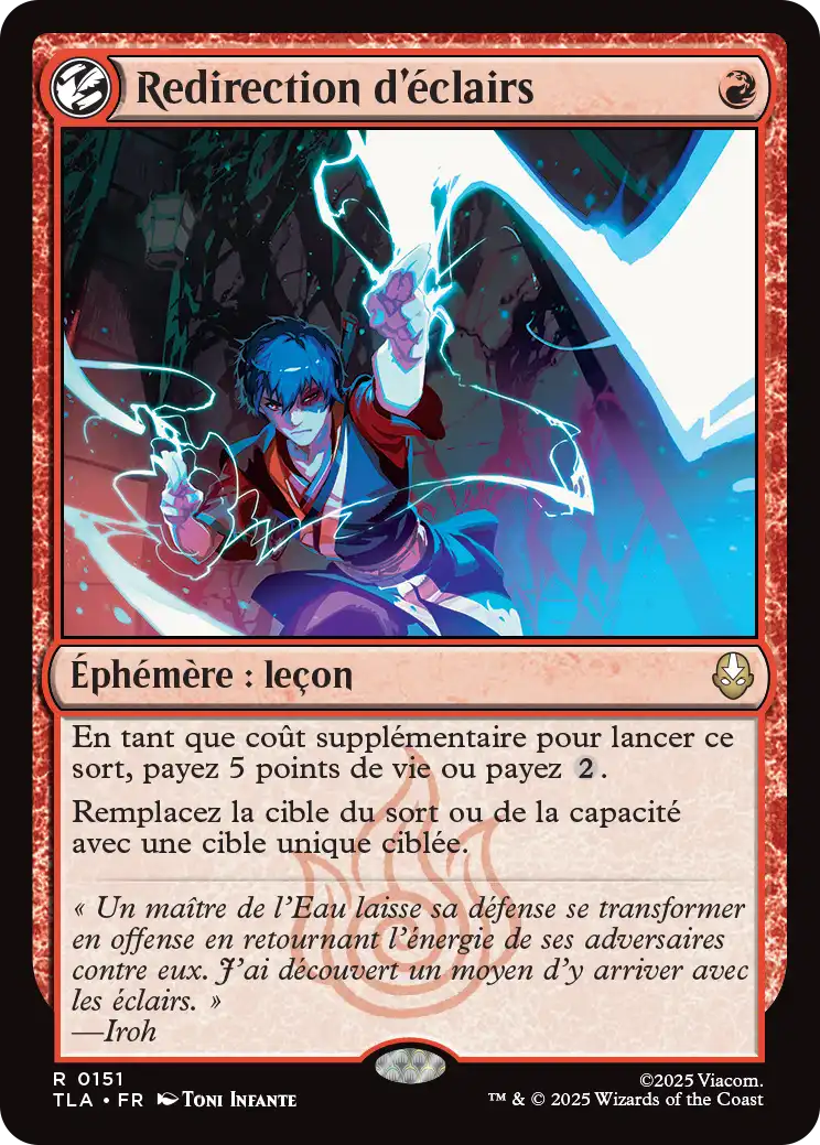 Redirection d'éclairs est un éphémère qui vous permet de changer la cible d'un sort ou d'une capacité avec une cible unique. Vous pouvez la jouer pour 3 manas dont un rouge et 2 incolores, ou pour un simple mana rouge et 5 points de vie.