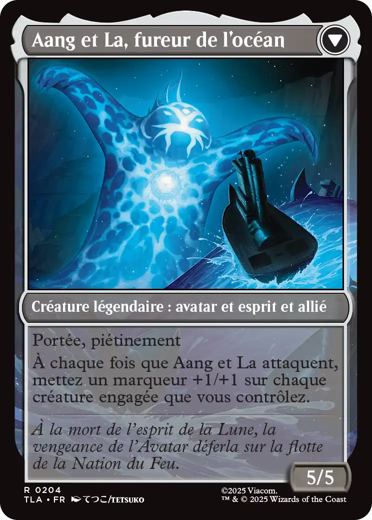 Une fois sur le champ de bataille, Aang est une 2/3 avec le vol qui peut contourner les défenses adverses. Il peut ensuite se transformer en payant 8 manas, une condition plutôt difficile à remplir, même si "Maîtriser l'Eau" pourra grandement vous aider à y arriver. Vous profiterez ensuite d'une 5/5 avec portée et piétinement qui donne un marqueur +1/+1 à chacune de vos créatures engagées lorsqu'elle attaque.