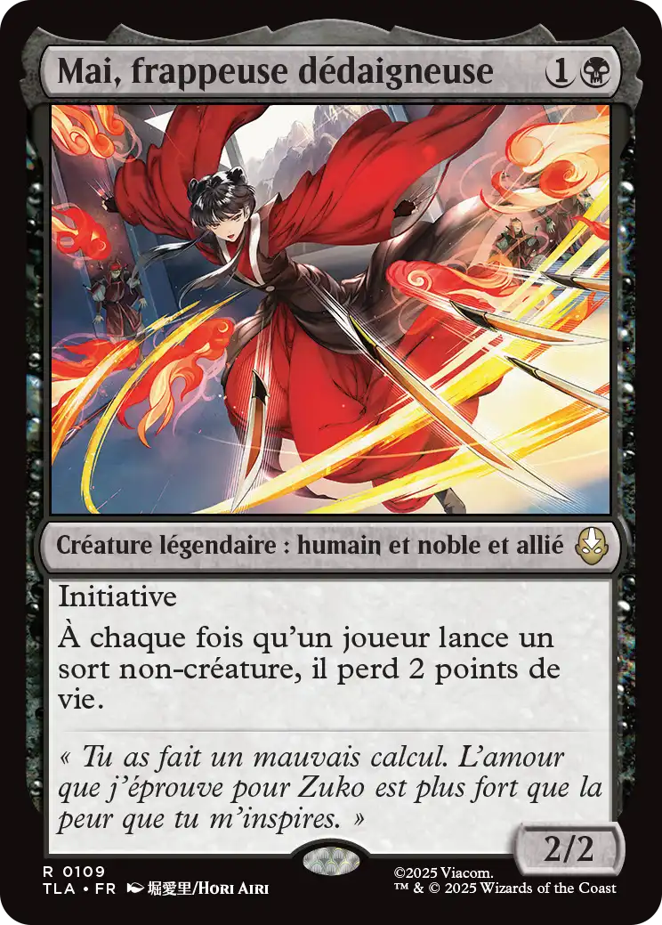 Mai, frappeuse dédaigneuse est une 2/2 avec l'initiative pour 2 manas. Elle fait perdre 2 points de vie à un joueur lorsqu'il lance un sort non-créature.