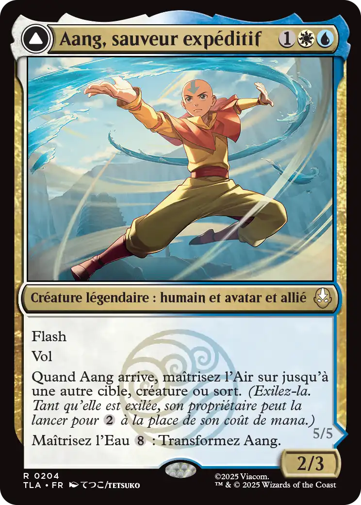 Aang, sauveur expéditif est une 2/3 avec le vol pour 3 manas et jouable en Flash. Quand il arrive, on peut maîtriser l'air sur une autre créature ou sur un sort. On exile donc ce sort ou cette créature, et son propriétaire peut le lancer depuis l'exil en payant 2 manas incolores.