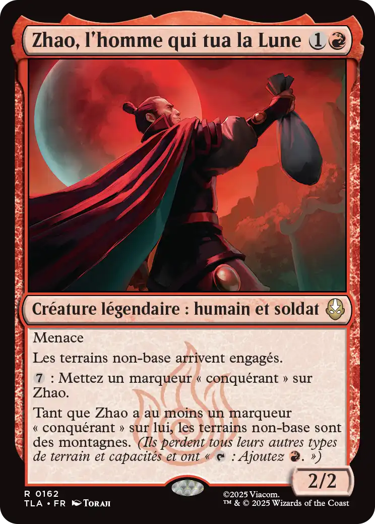 Pour 7 manas incolores, vous pouvez mettre un marqueur conquérant sur Zhao. Il gagne alors une capacité qui transforme tous les terrains non-base en montagne. Cette capacité qui évoque Lune de sang semble bien difficile à activer, mais elle pourra empêcher votre adversaire d'accéder à certaines de ses couleurs.