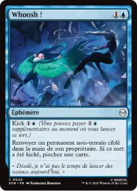 Whoosh ! renvoie un permanent non-terrain dans la main de son propriétaire et vous fait piocher une carte si vous payez le coût de Kick. Vous pouvez gérer temporairement un permanent adverse gênant ou sauver l'un des vôtres.