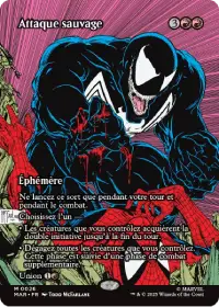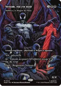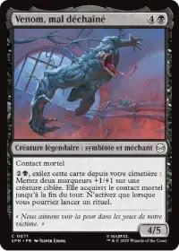 Venom, mal déchaîné est 4/5 avec le contact mortel. Il peut s'exiler depuis votre cimetière en payant 3 manas pour donner 2 marqueurs +1/+1 et la menace jusqu'à la fin du tour à l'une de vos créatures.
