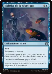 Maîtrise de la robotique est une aura pour 5 manas jouable en Flash. Elle donne +2/+2 à la créature enchantée et crée 2 jetons créature-artefact 1/1 avec le vol. Elle modifie l'une de vos créatures et augmente considérablement votre force de frappe.