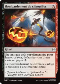 Bombardement de citrouilles inflige 3 blessures à une créature ciblée. En tant que coût supplémentaire, vous devez payer 2 manas incolores ou vous défausser d'une carte. Il vous permet ainsi de jouer une carte avec le désordre et peut tout de même être joué pour 3 manas si vous n'avez rien à défausser.