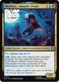 Morbius, vampire vivant est une 3/1 avec vol, vigilance et lien de vie. C'est un atout dans la course aux points de vie face à votre adversaire. Une fois au cimetière, il peut s'exiler en payant 2 manas pour vous faire mettre en main la carte de votre choix parmi les 3 du dessus de votre bibliothèque.