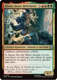 Rhino, brute déferlante est une 6/7 avec vigilance, piétinement et célérité pour 7 manas. Il vous fait également piocher lorsqu'il attaque si vous avez lancé ce tour-ci un sort avec un coût de 4 ou plus.