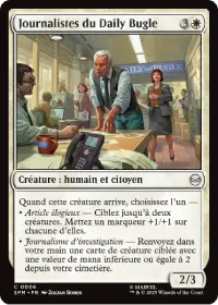 Journalistes du Daily Bugle vous permet d'obtenir 2 créatures modifiées en distribuant 2 marqueurs +1/+1. Il peut d'ailleurs se cibler lui-même. Son 2ème mode vous permet de reprendre en main une créature coûtant 2 ou moins depuis votre cimetière.