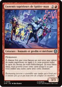 Ennemis supérieurs de Spider-Man est une 3/3 piétinement qui vous permet d'exiler et de jouer la carte du dessus de votre bibliothèque à chaque fois que vous lancez un sort de valeur 4 ou plus. Cette carte reste jouable jusqu'à ce que vous en exiliez une autre de cette manière.