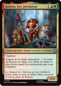 Kraven, fier prédateur possède la vigilance et sa force est égale à la valeur de mana la plus élevée parmi les permanents que vous contrôlez. Il est donc au minimum 3/4, mais sa force peut être bien plus élevée.
