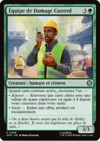 Équipe de Damage Control est une 3/3 qui vous permet de récupérer dans votre main depuis votre cimetière une carte de créature avec une valeur de mana supérieure ou égale à 4. Vous pouvez choisir à la place d'exiler un artefact ou un enchantement.