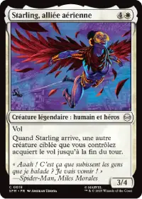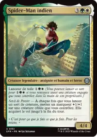 Spider-Man indien est une 4/4 qui peut se jouer pour seulement 3 manas avec Lanceur de toile. À chaque fois que vous lancez un sort de créature, vous donnez un marqueur +1/+1 et le vol jusqu'à la fin du tour à l'une de vos créatures.
