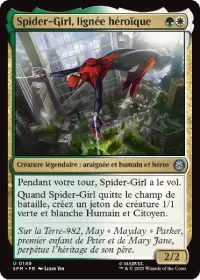 Spider-Girl, lignée héroïque est une 2/2 pour 2 manas qui a le vol pendant votre tour. Lorsqu'elle quitte le champ de bataille, elle crée un jeton 1/1. Elle a donc une excellente synergie avec lanceur de toile. Facile a engager dans les premiers tours grâce au vol et avec un effet bonus lorsqu'elle retourne en main.