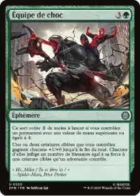 Équipe de choc donne +1/+0 à jusqu'à 2 de vos créatures et inflige leurs forces cumulées à une créature adverse. Ce sort ne vous coûtera que 2 manas si vous contrôlez un permanent avec une valeur de mana de 4 ou plus.