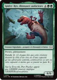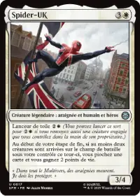 Spider-UK est une 3/4 avec lanceur de toile qui fait piocher et gagner 2 points de vie à la fin de chacun de vos tours où au moins deux créatures sont arrivées en jeu.