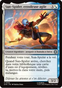 Sun-Spider, entoileuse agile a le vol durant votre tour et contourne les défenses ennemies. En arrivant en jeu, il vous permet d'aller chercher dans votre bibliothèque un aura ou un enchantement pour modifier l'une de vos créatures.