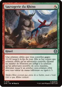 Sauvagerie du Rhino booste une de vos créatures avant de se battre contre une créature adverse et de détruire un artefact non-créature de coût 3 ou moins si la sauvagerie a infligé un surplus de dégâts.
