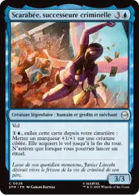 Scarabée, successeure criminelle est un méchant 3/3 avec le vol qui constitue une menace. En payant 2 manas et en l'exilant depuis le cimetière, vous donnez un marqueur +1/+1 à l'une de vos créatures ainsi que le vol jusqu'à la fin du tour. Une capacité qui pourrait bien vous aider à conclure la partie.
