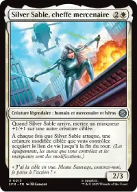 Silver Sable, cheffe mercenaire met un marqueur +1/+1 sur l'une de vos autres créatures en arrivant en jeu. À chaque fois qu'elle attaque, elle donne le lien de vie à l'une de vos créatures modifiées.
