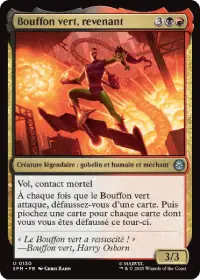 Bouffon vert, revenant est une 3/3 avec le vol et le contact mortel. Lorsqu'il attaque, vous vous défaussez d'une carte avant de piocher une carte pour chaque carte défaussée ce tour-ci. C'est un moteur de défausse qui vous donne également un avantage en cartes.