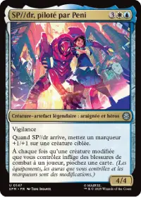 SP//dr, piloté par Peni est une 4/4 vigilance pour 5 manas qui vous assure d'avoir une créature modifiée puisqu'elle donne un marqueur +1/+1 en arrivant en jeu. Elle vous fait piocher à chaque fois qu'une de vos créatures modifiées inflige des blessures de combat à un joueur.