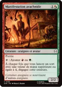Manifestation arachnide est 2/2 avec la portée et produit du mana rouge ou vert en s'engageant. Il se dégage à chaque fois que vous jouez un sort de valeur supérieure ou égale à 4.