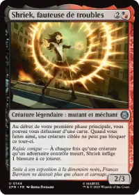 Shriek, fauteuse de troubles vous permet de vous défausser d'une carte au début de votre première phase principale. Elle empêche alors une créature de bloquer. Elle inflige également une blessure à votre adversaire à chaque fois qu'une de ses créatures meurt.
