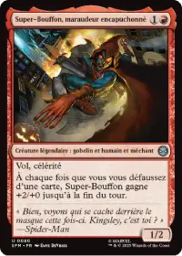 Super-Bouffon, maraudeur encapuchonné est une 1/2 avec le vol et la célérité. Il gagne +2/+0 à chaque fois que vous vous défaussez d'une carte et peut rapidement infliger de nombreux dégâts.