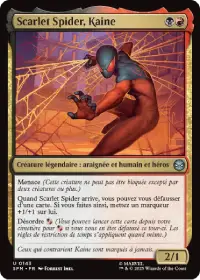 Scarlet Spider, Kaine est une 2/1 avec la menace pour 2 manas. En arrivant en jeu, il vous permet de vous défausser d'une carte pour lui donner un marqueur +1/+1. Il peut également être joué depuis votre cimetière grâce au désordre pour un mana rouge ou noir.