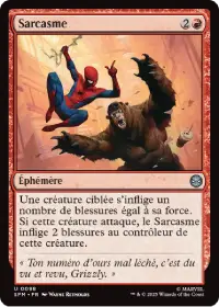 Sarcasme inflige à une créature autant de blessures que sa force en éphémère et fait perdre en plus 2 points de vie à son contrôleur si elle attaquait.