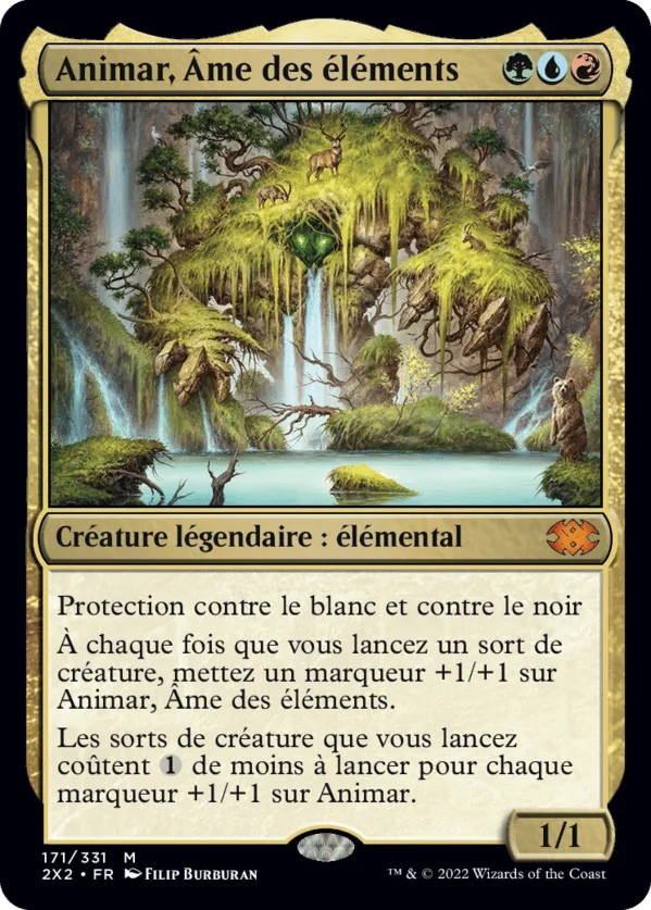 Animar, âme des éléments s'intègre parfaitement à ce deck en tant qu'élémentaire. Il gagne un marqueur +1/+1 à chaque sort de créature que vous lancez. Il réduit ensuite d'un mana incolore le coût de vos sorts de créatures pour chaque marqueur +1/+1 sur lui. Vos autres élémentaux deviennent alors très faciles à poser.