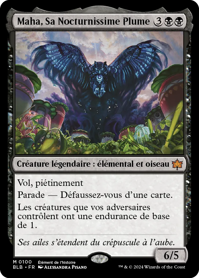 Maha, sa Nocturnissime Plume réduit à 1 l'endurance de base de toutes les créatures adverses. Il vous suffira donc d'un seul marqueur -1/-1 pour tuer une créature. De même, Maha tuera chaque créature avec au moins un marqueur -1/-1 sur elle lors de son arrivée en jeu. En tant que 6/5 avec le vol et le piétinement et protégée par la parade, c'est également une véritable menace.