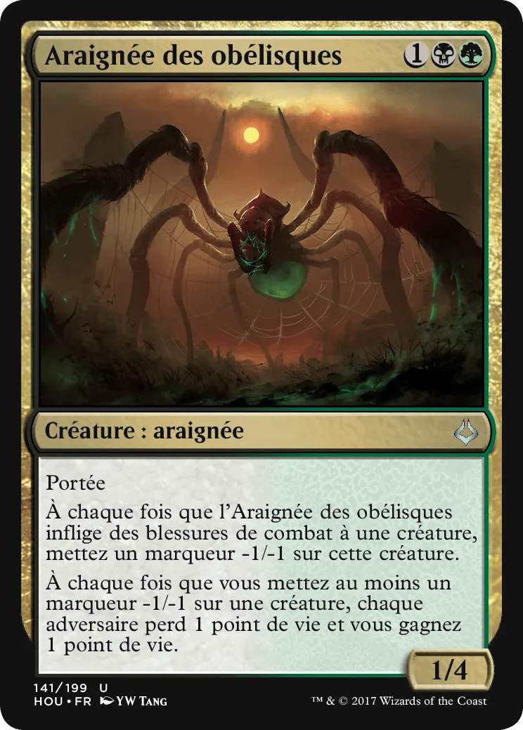 Araignée des obélisques est un bon bloqueur avec la portée qui donne un marqueur -1/-1 à chaque créature qu'elle blesse en combat. Elle vous permet surtout de faire perdre 1 point de vie à chaque adversaire et de vous faire gagner un point de vie pour chaque marqueur -1/-1 que vous placez sur une créature. Elle vous fera gagner de précieux points de vie tout en accélérant la mort de vos adversaires.
