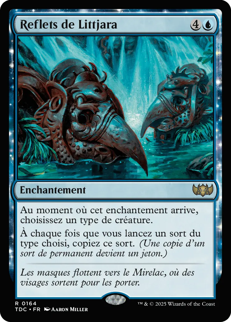 Reflets de Littjara est un enchantement incontournable dans les decks basés sur un type de créature. Il vous permet de copier chaque sort que vous lancez d'un type choisi.