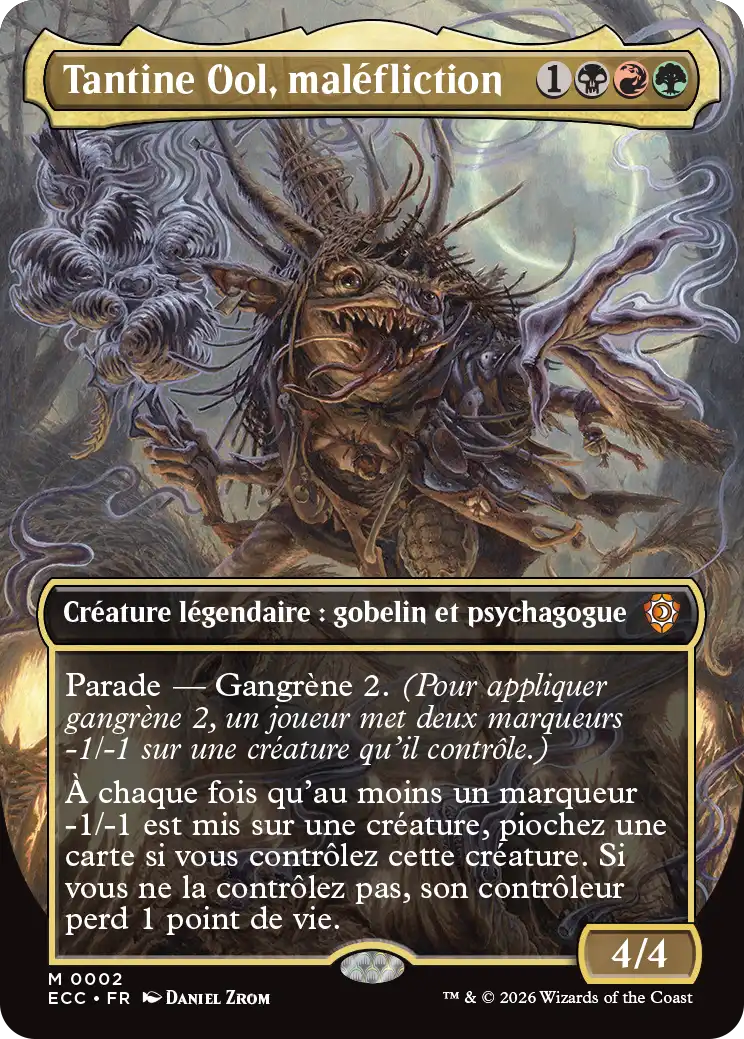 Tantine Ool, maléfliction est la Commandante de ce deck. C'est une 4/4 pour 4 manas qui est protégée grâce à la parade. Votre adversaire devra appliquer Gangrène 2 pour pouvoir la cibler.