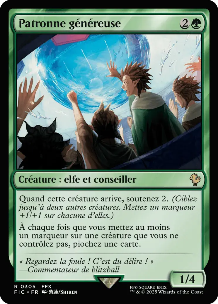 Patronne généreuse renforce vos créatures en soutenant 2 à son arrivée en jeu. Elle vous permet ensuite de piocher une carte à chaque fois que vous mettez des marqueurs -1-/1 sur une créature adverse. C'est donc une source de pioche très efficace dans votre deck. Attention toutefois, vous ne piocherez pas en faisant appliquer la Gangrène à votre adversaire, puisque c'est lui qui place des marqueurs sur ses propres créatures.