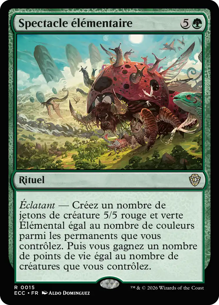 À chaque fois que vous sacrifiez un élémental non-jeton, vous-en créez une copie avec célérité. Vous devez sacrifier ce jeton au début de votre étape de fin à moins de payer un mana de chaque couleur.