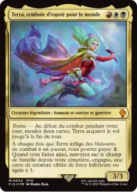 Terra, symbole d'espoir pour le monde est la Commandante de ce Deck. C'est une 3/3 pour 3 manas avec une capacité qui se déclenche lorsqu'elle inflige des blessures de combat.