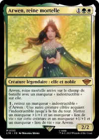 Arwen, reine mortelle arrive en jeu avec un marqueur indestructible. En retirant ce marqueur indestructible, vous donnez l'indestructible a une autre créature jusqu'à la fin du tour, en plus de mettre un marqueur +1/+1 et un marqueur lien de vie sur Arwen et sur la créature qu'elle a ciblé.