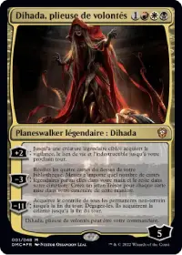 Dihada, plieuse de volontés est une Planeswalker dont la première capacité vous permet de protéger votre Commandante, alors que sa 2ème capacité alimente votre cimetière et vous fournit des jetons trésor.