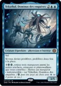 Tekuthal, Dominus des enquêtes double tous vos effets de prolifération. En retirant 3 marqueurs parmi les créatures, artefacts et planewalkers que vous contrôlez, vous pourrez donner à Tekuthal un marqueur indestructible que vous pourrez ensuite proliférer plusieurs fois avant de le déplacer sur votre Commandant et sur vos créatures importantes.