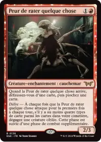 Peur de rater quelque chose vous fait défausser une carte et piocher en arrivant en jeu pour alimenter votre cimetière. Grâce au délire, il vous donne une phase d'attaque supplémentaire à chaque tour, permettant ainsi à votre Commandante de réanimer une créature de plus.