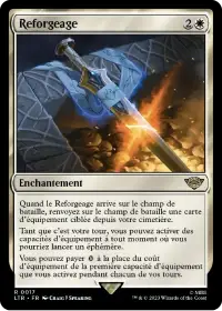 Reforgeage vous fait renvoyer un équipement depuis votre cimetière directement en jeu. Pendant votre tour, vous pouvez utiliser vos capacités d'équipements en éphémère et payer zéro à la place du coût de la première capacité d'équipement que vous activez à chaque tour.