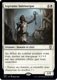 Aspirante luminarque est une 1/1 pour 2 manas qui met un marqueur +1/+1 sur une de vos créatures à chacune de vos phases de combat. C'est donc une créature avec un marqueur +1/+1 capable d'attaquer dès le tour 3 au moment où votre Commandant arrive.