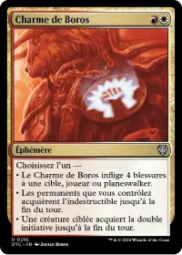 Charme de Boros donne le choix entre 3 effets très utiles. C'est à la fois un removal, une protection pour votre Commandant, ou une manière d'infliger de nombreux dégâts supplémentaires en donnant double initiative à une créature.