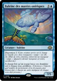 Baleine des marées oniriques est une 7/5 qui arrive en jeu dès le tour 3 avec deux marqueurs temps, associés à la disparition 2. Elle vous permet de proliférer à chaque fois qu'un joueur lance son 2ème sort lors d'un tour.