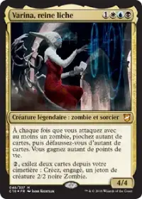 Varina, reine liche regroupe plusieurs des axes d'améliorations possibles pour ce deck. Elle nous fait piocher et défausser d'autant de cartes que d'autres zombies attaquants et booste d'autant l'ensemble de nos créatures grâce à notre Commandant.