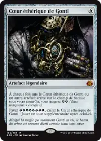 Cœur éthérique de Gonti produit 2 énergies lorsqu'il arrive en jeu et à chaque fois qu'un autre artefact arrive, comme les copies créées par Saheeli. C'est l'un des meilleurs moyens de dépenser vos marqueurs énergie, en gagnant un tour supplémentaire.